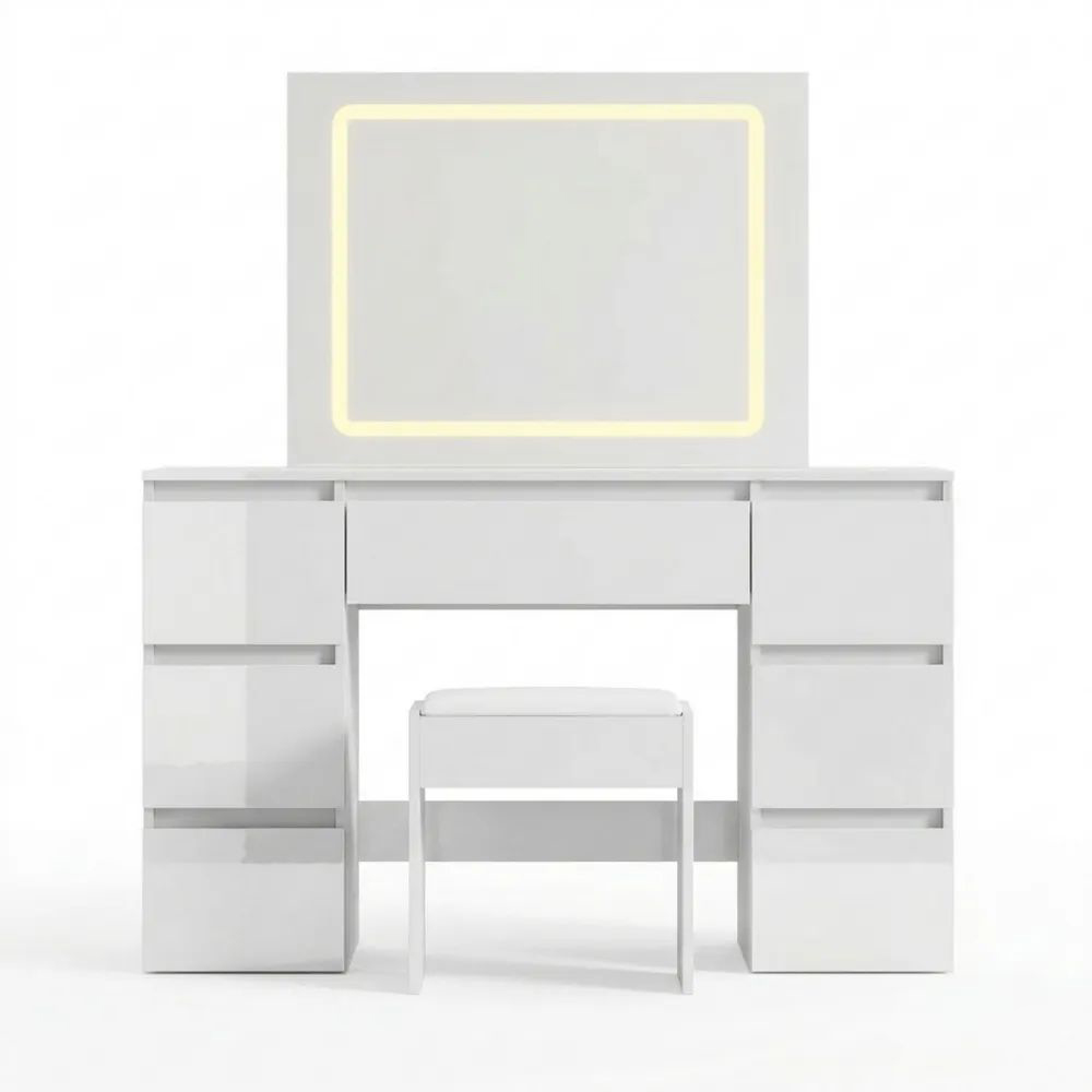 Moderner Schminktisch mit Spiegel, LED-Beleuchtung, 9 Schubladen und Hocker, Weiß